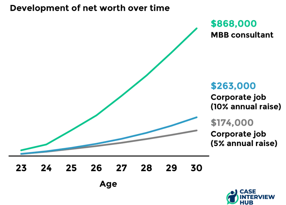 By the age of 30, an MBB consultant's net worth may be at least half a million dollars ahead of corporate peers. Yes, he or she will have worked more and in a more hectic environment — but that's what ambitious people are ready for. By the age of 40, we're talking already about multiple million dollars. These assumptions are all quite conservative. For example, we assume that the consultant simply stays at project leader level. If instead he reaches partner level the whole calculation looks entirely different again. All that is not to say that a corporate job can't lead to a successful career. Yes, climbing the corporate ladder all the way to CEO is possible. But even here the consultant is ahead, as he'll skip multiple steps on that ladder (as evidenced by the vast number of MBB alumni among corporate executives).